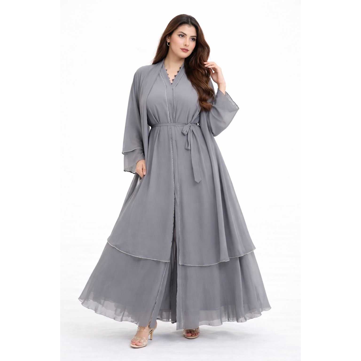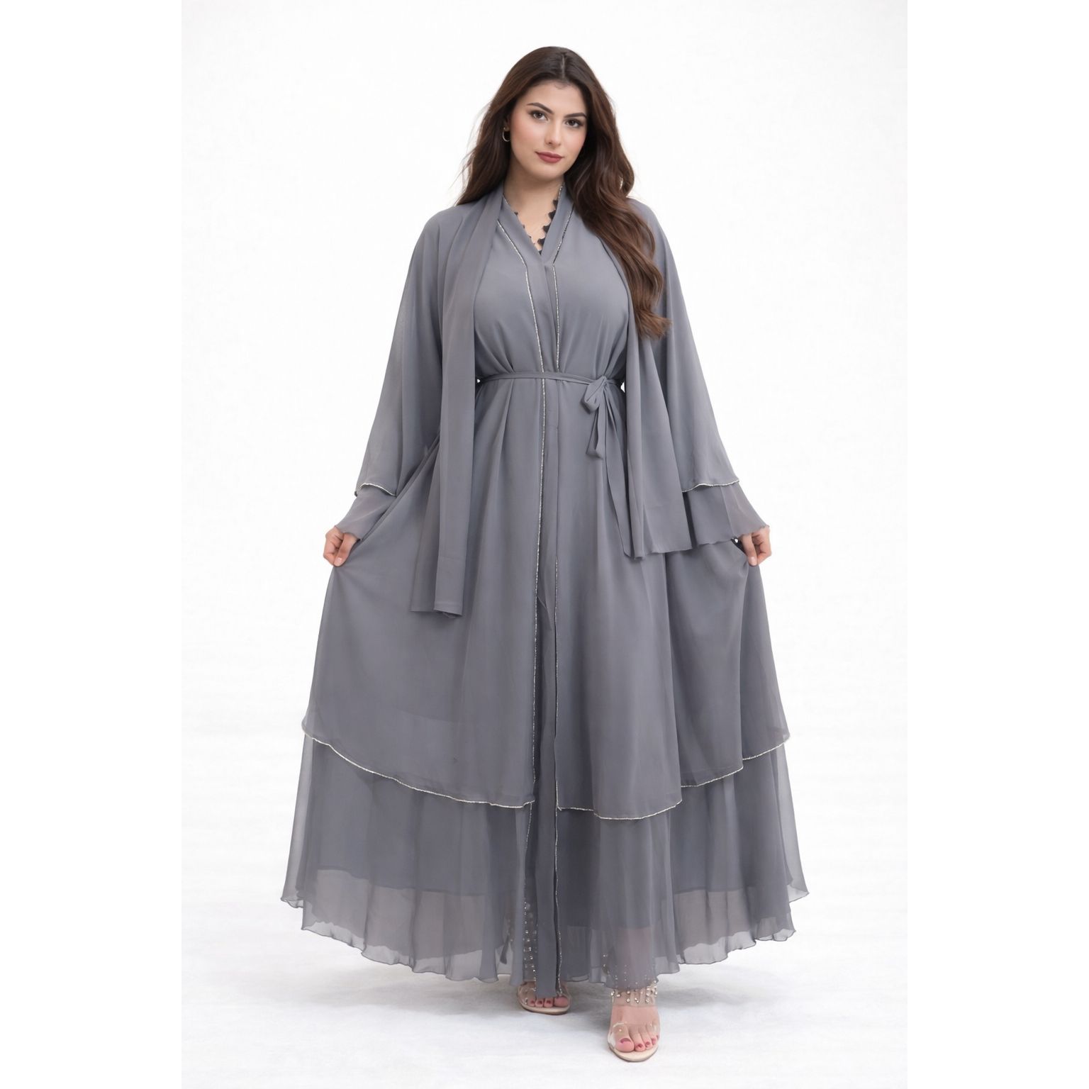 Abaya en mousseline (chiffon) gris perle aérienne confectionnée dans un tissu fluide et léger, sublimée par des finitions délicates argentées le long de l’ouverture et des coutures.