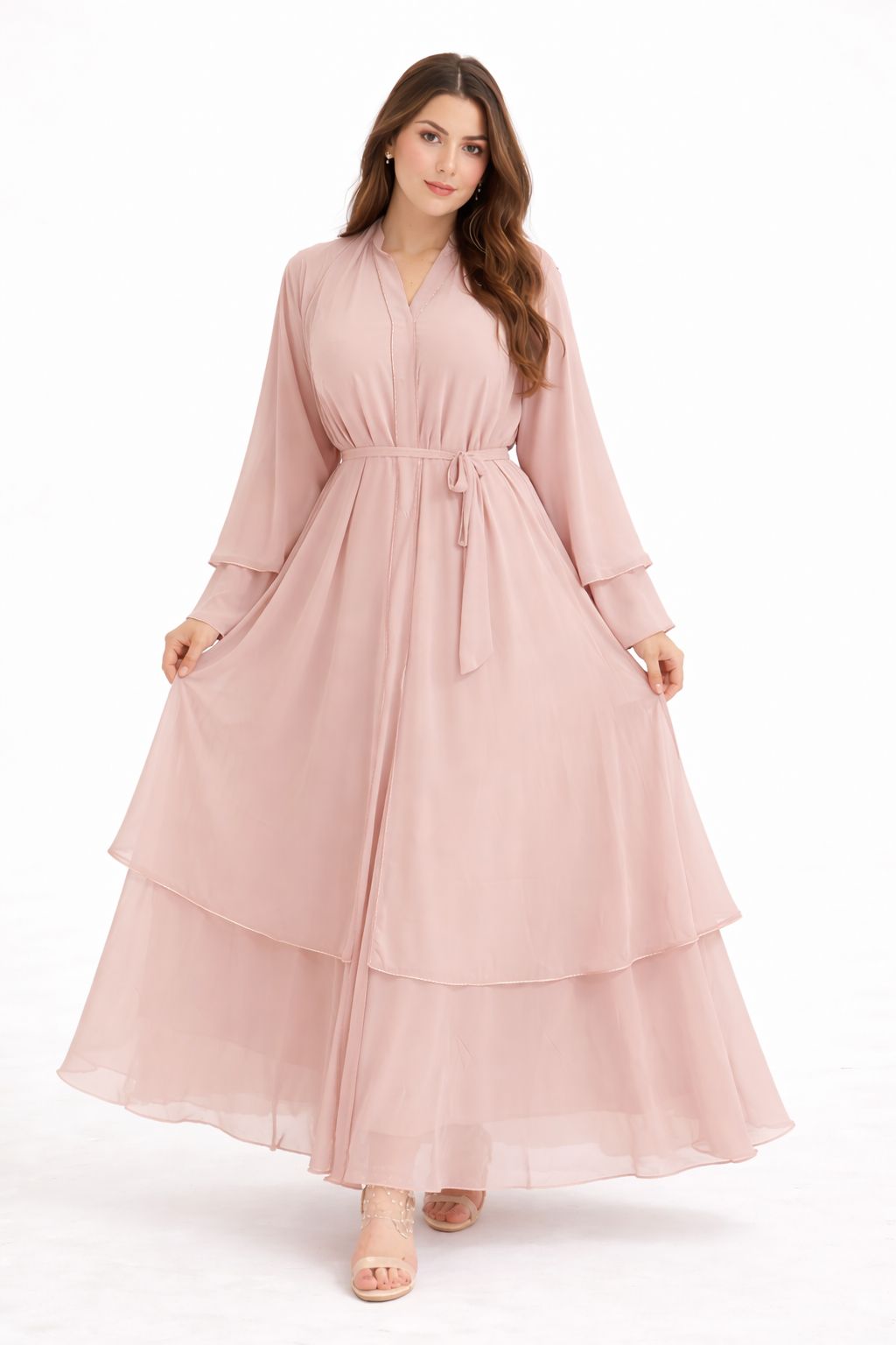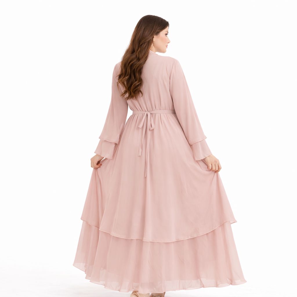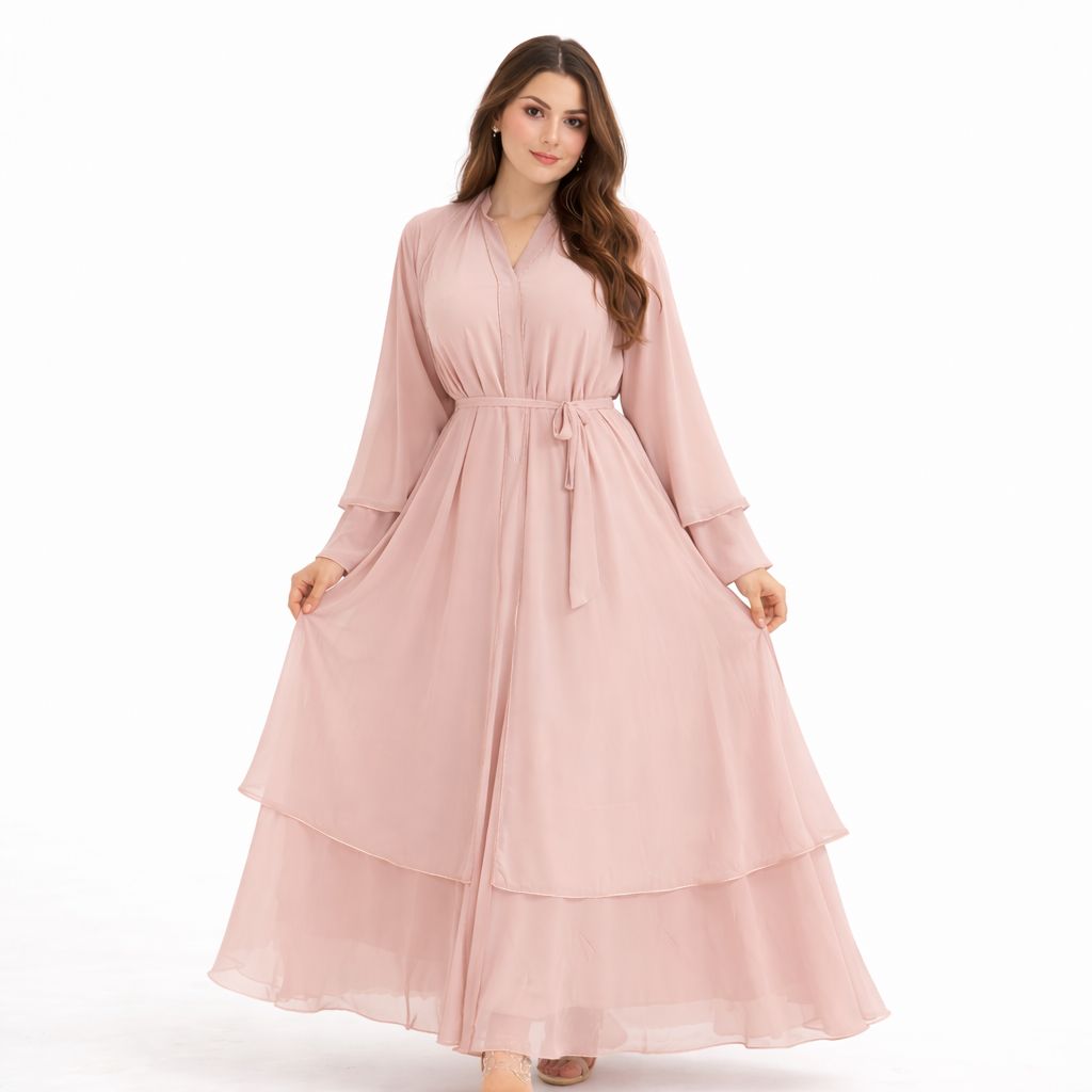 Abaya en mousseline (chiffon) Rose Poudré perle aérienne confectionnée dans un tissu fluide et léger, sublimée par des finitions délicates argentées le long de l’ouverture et des coutures.