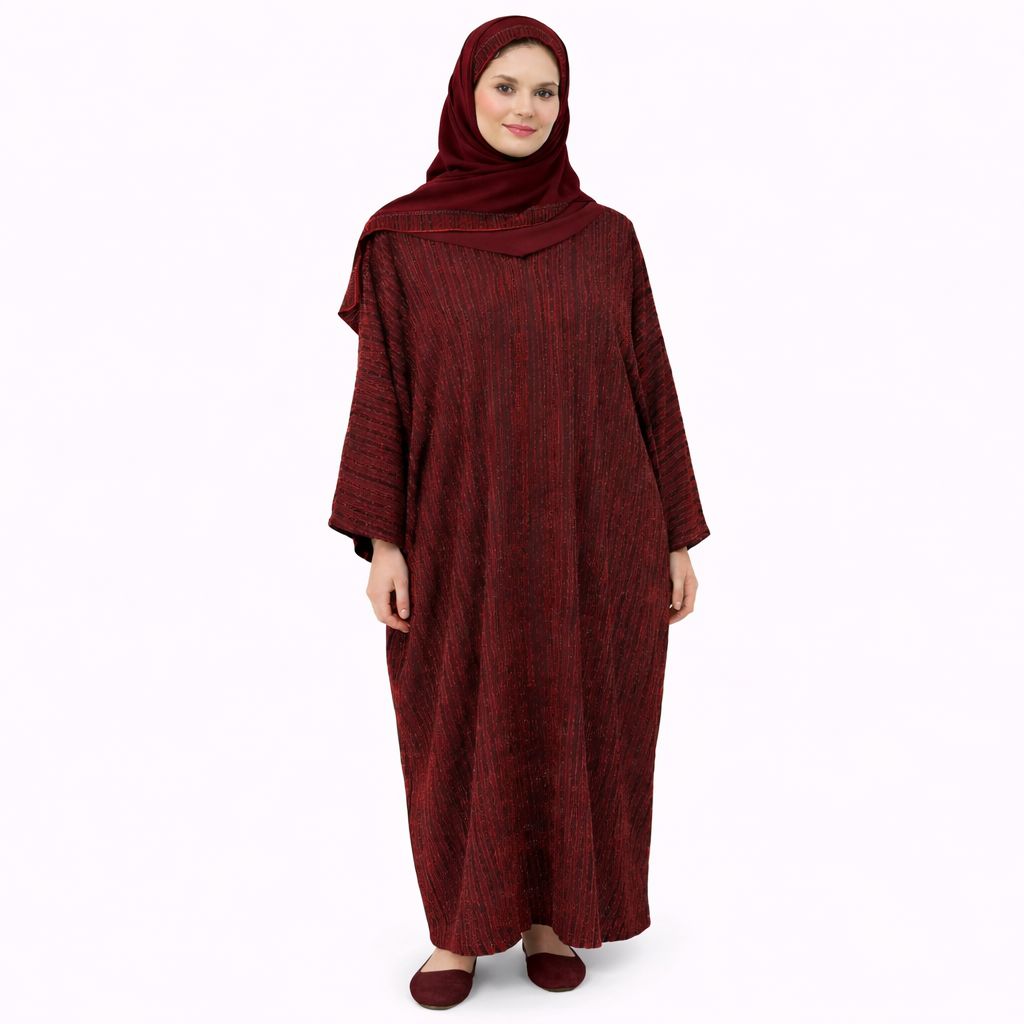 Cette abaya en jacquard effiloché uni en coton révèle une esthétique riche et chaleureuse. Le travail de texture vertical apporte relief et mouvement, tandis que le coton assure confort et respirabilité.