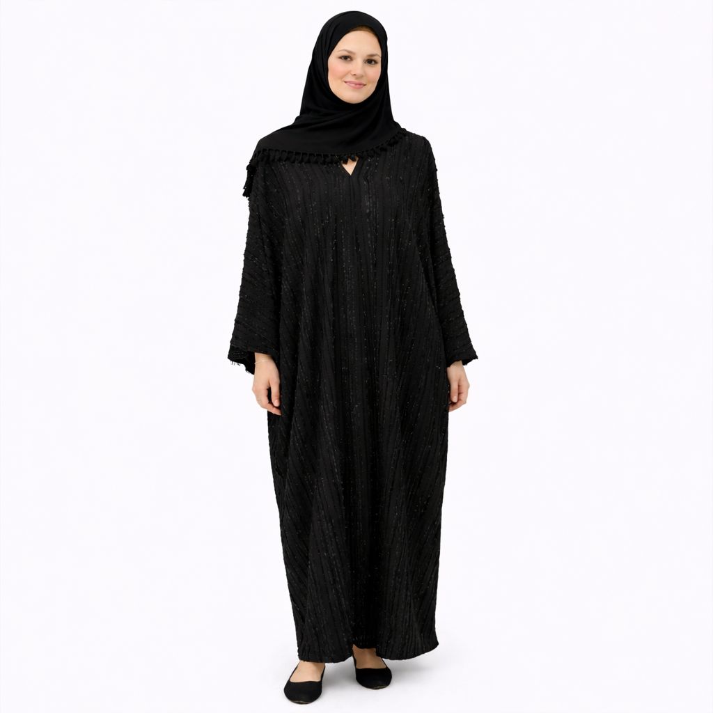 Intemporelle et structurée, cette abaya en jacquard effiloché uni en coton incarne un luxe sobre et puissant. Les lignes verticales effilochées se fondent dans le noir pour révéler un jeu de matière discret mais très couture.