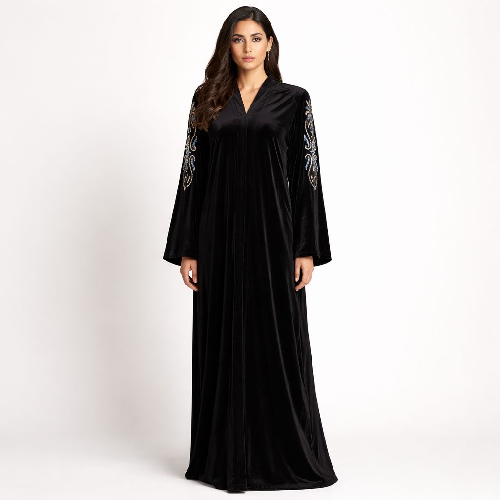 Cette abaya incarne un luxe profond et sophistiqué, pensée pour celles qui recherchent une pièce de caractère alliant élégance intemporelle et savoir-faire artisanal. Sa coupe longue et fluide épouse la silhouette avec douceur, offrant un tombé majestueux et naturellement élégant.