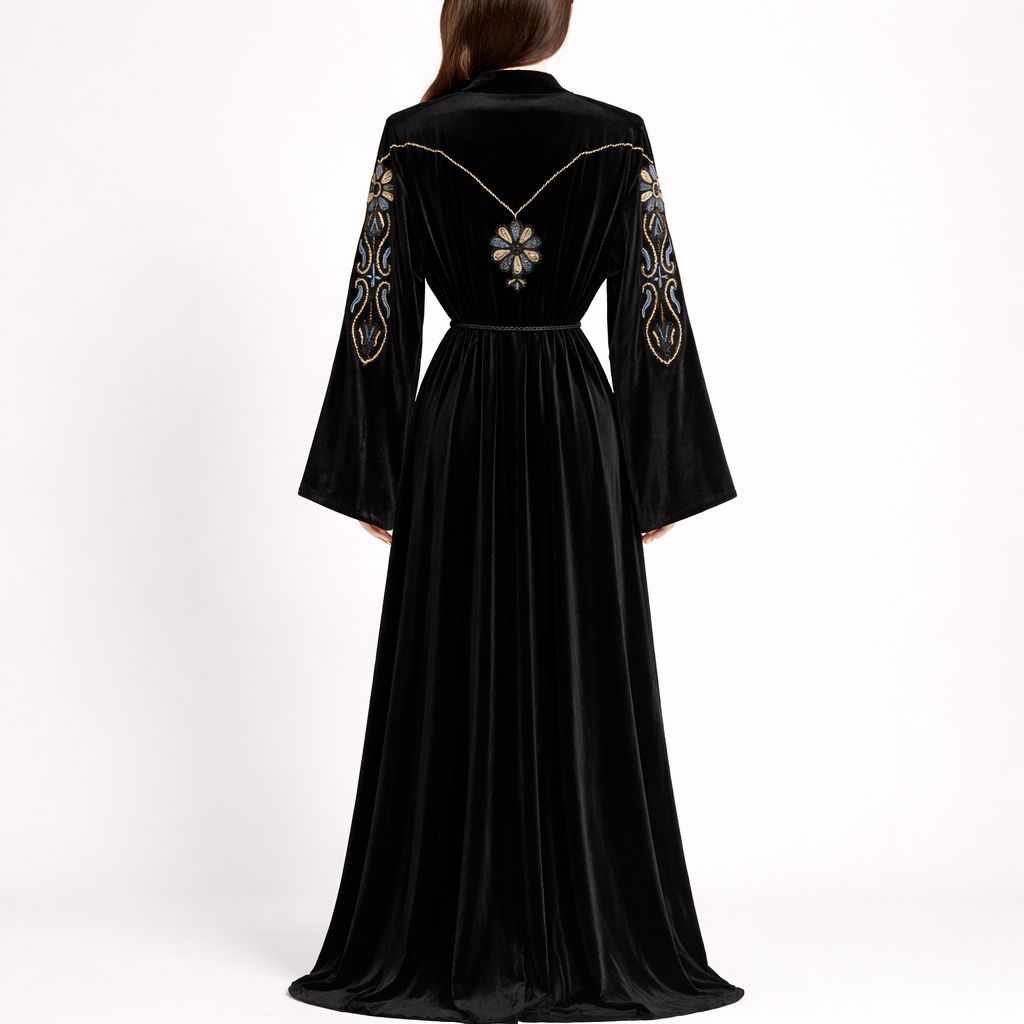 Les manches longues et larges sont sublimées par des motifs brodés floraux et arabesques, travaillés avec précision dans des tons contrastés aux reflets dorés et bleu nuit. Ces broderies délicates créent un équilibre parfait entre tradition et modernité, tout en mettant en valeur la noblesse du velours.